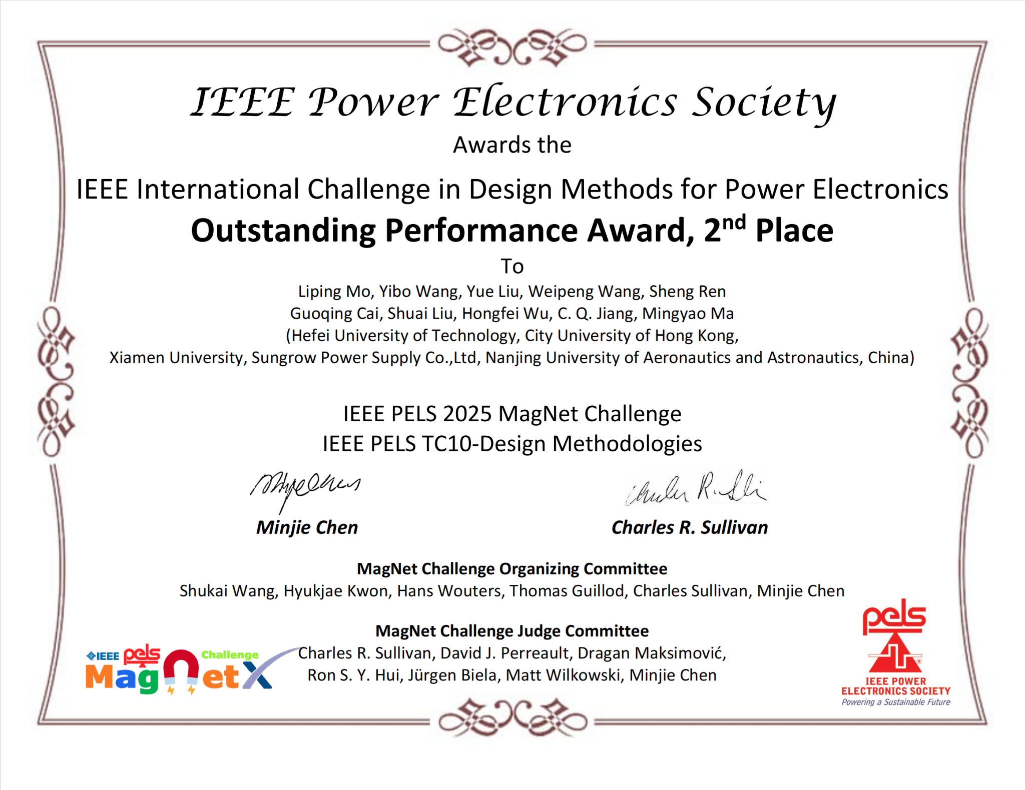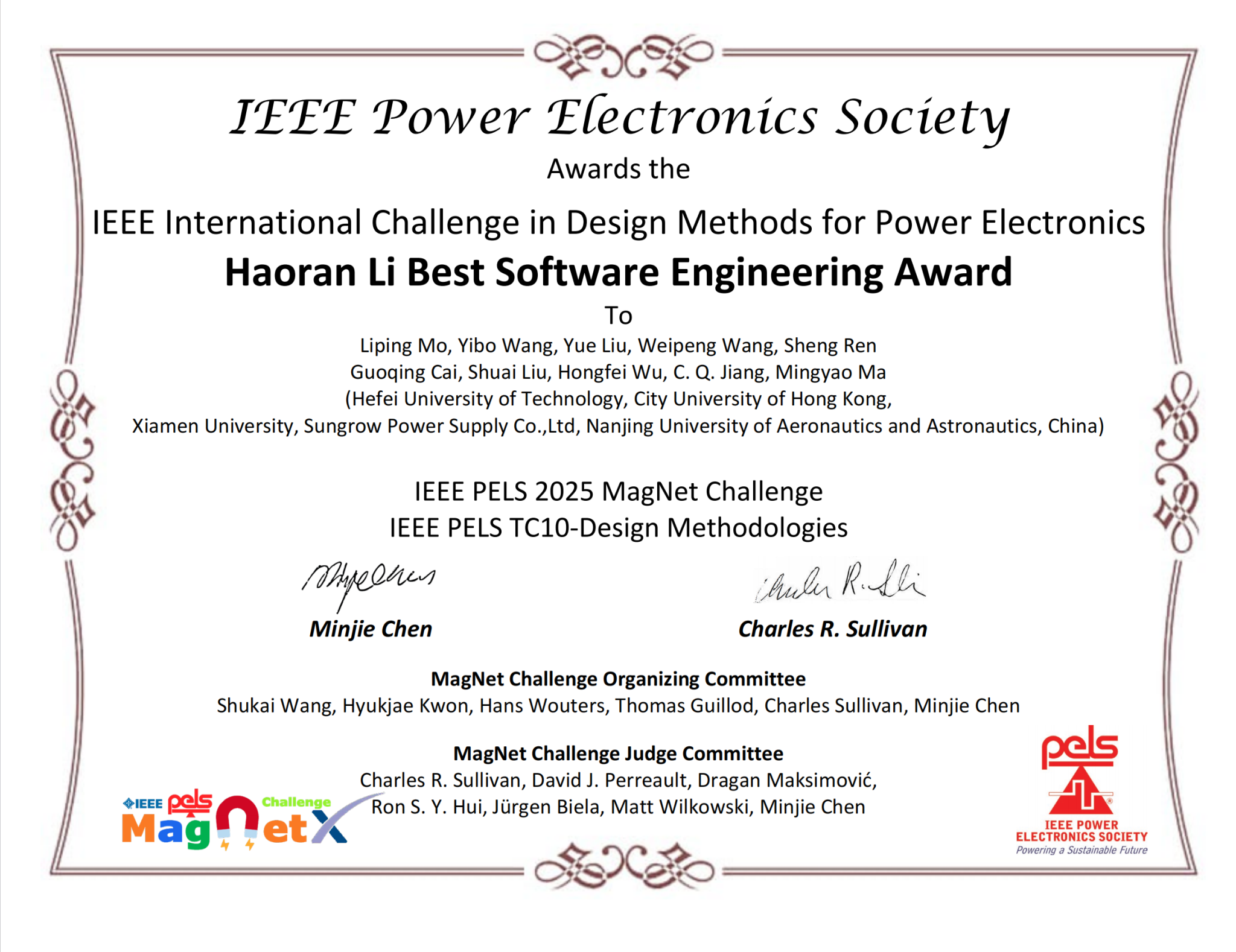 近日,全球电力电子磁建模领域顶级赛事IEEE MagNet Challenge 2 圆满收官。由我校2138CC太阳集团恒爱精诚团队莫李平牵头,联合香港城市大学、厦门大学等高校组建的跨校联合战队HFUT-CITYUHK-XMU,在产业指导香港城市大学江朝强教授的悉心引领和阳光电源股份有限公司的全力支持下脱颖而出,一举斩获杰出性能奖全球第二名、最佳软件工程奖全球第一名(全球唯一)的佳绩,揽获赛事奖金10000美元,成为本次大赛亚洲地区唯一获奖队伍,也是本届大赛中唯一一支同时斩获两项大奖的参赛队伍,充分彰显了我校在电力电子磁建模领域的国际领先水平。