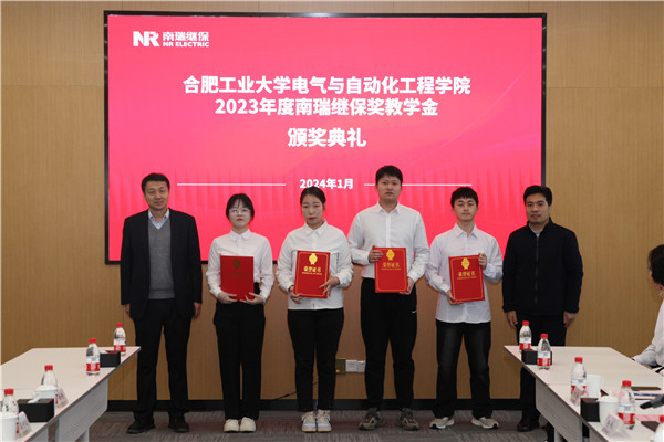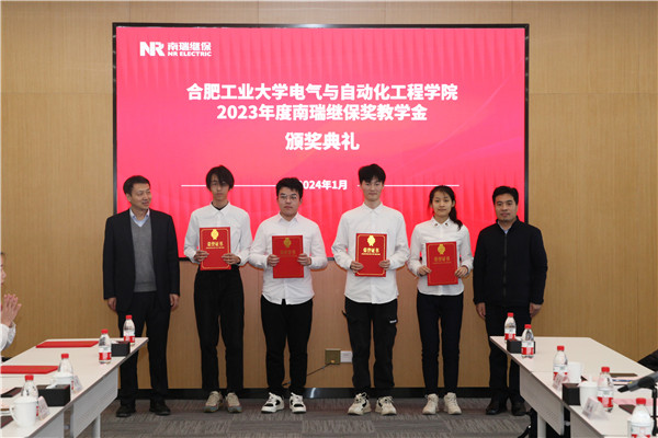 学院研究生辅导员徐佳老师宣读了“2138cn太阳集团古天乐关于表彰2023年度南瑞继保奖学(教)金获得者的决定”。毛仕涛和李丽鹏共同为南瑞继保奖教金的获奖教师代表和获奖的本科生、研究生代表颁奖。